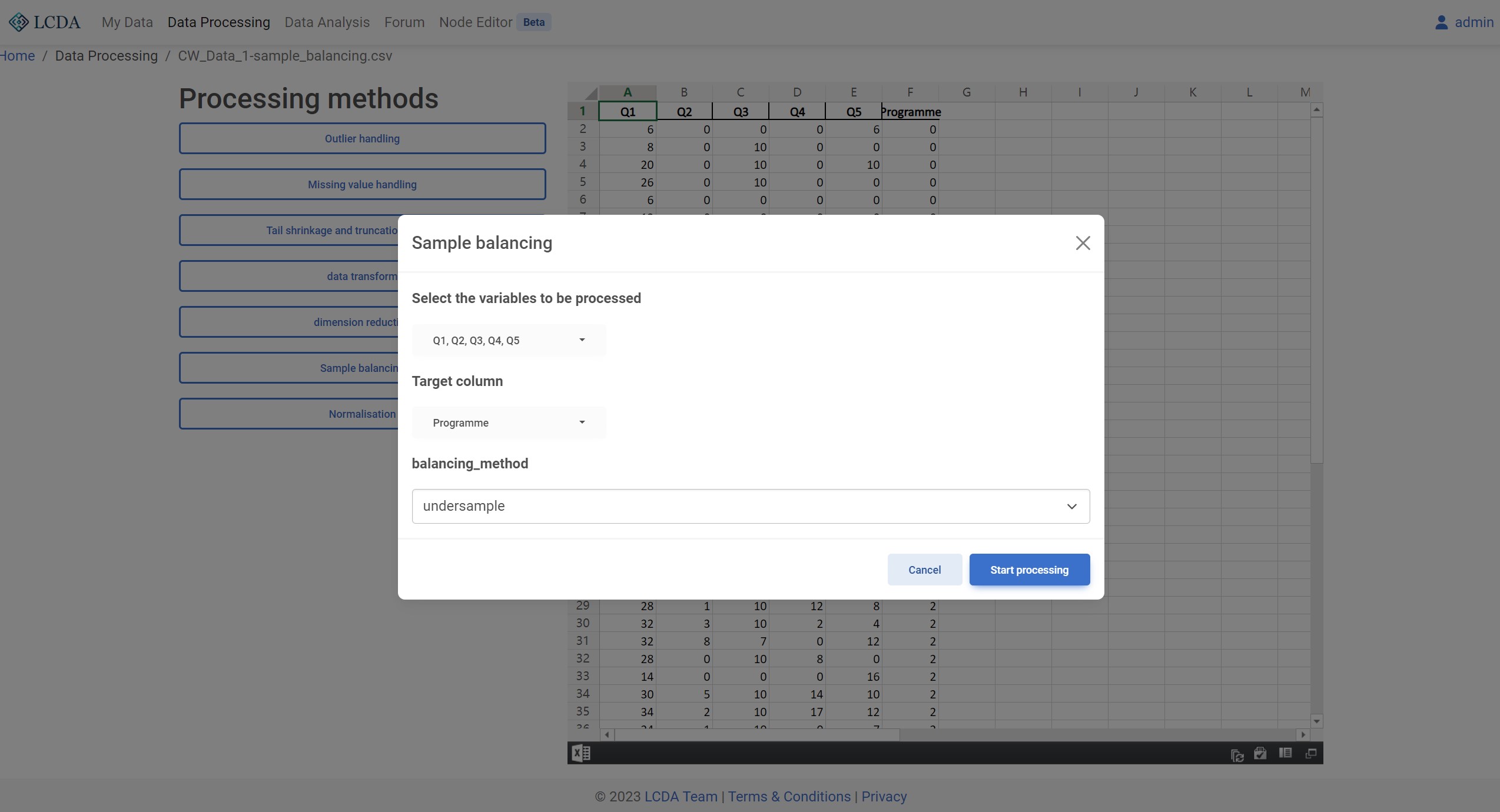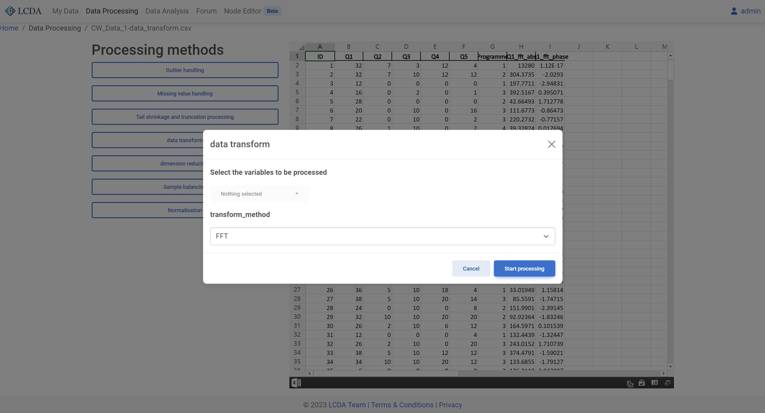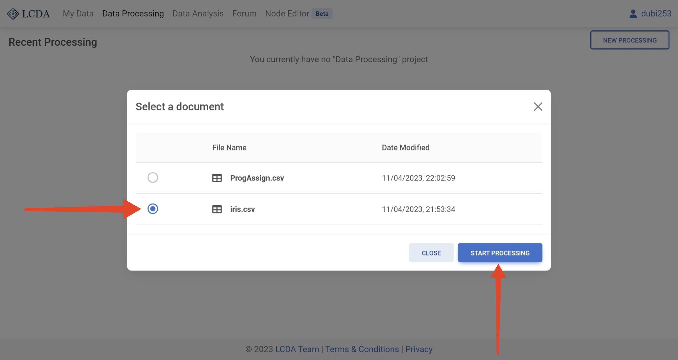 In the pop-up window, you will need to select a dataset (Want to upload your own dataset? Please refer to the My Data user manual to learn how to upload a dataset). Then click on the START PROCESSING button in the lower right corner to start data processing. The system will automatically create a data processing project for you.