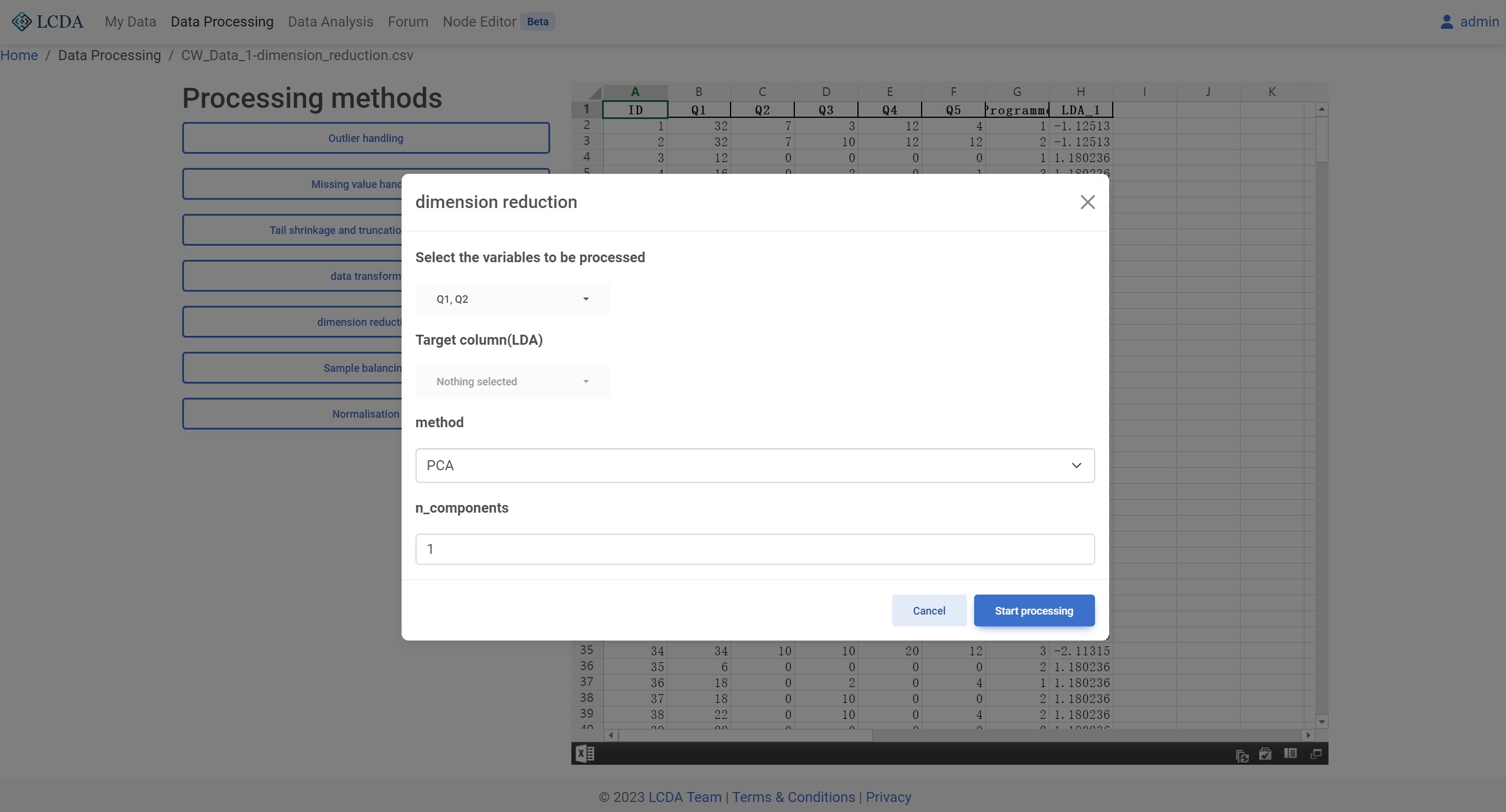 method: Dimensionality reduction method. Currently supports PCA and LDA two methods.n_components: Number of components to keep. Data types are numeric.