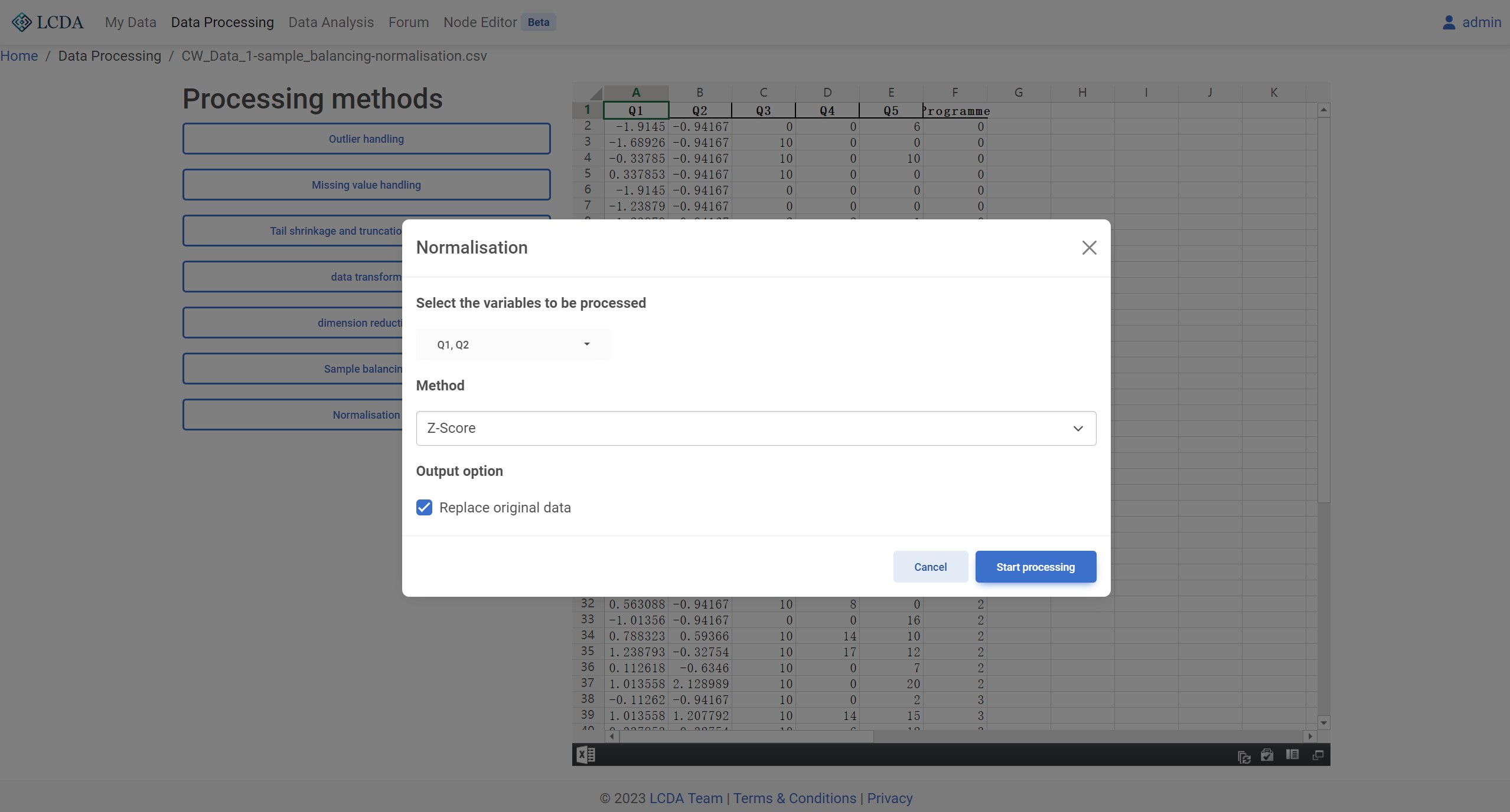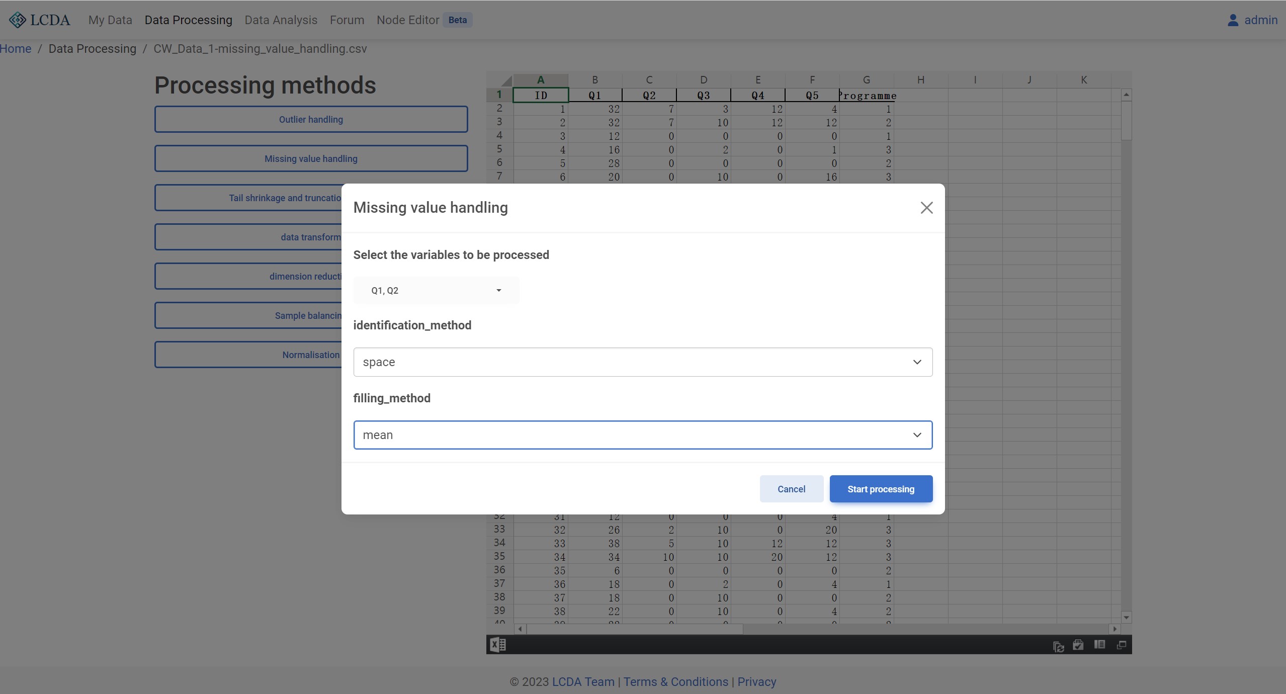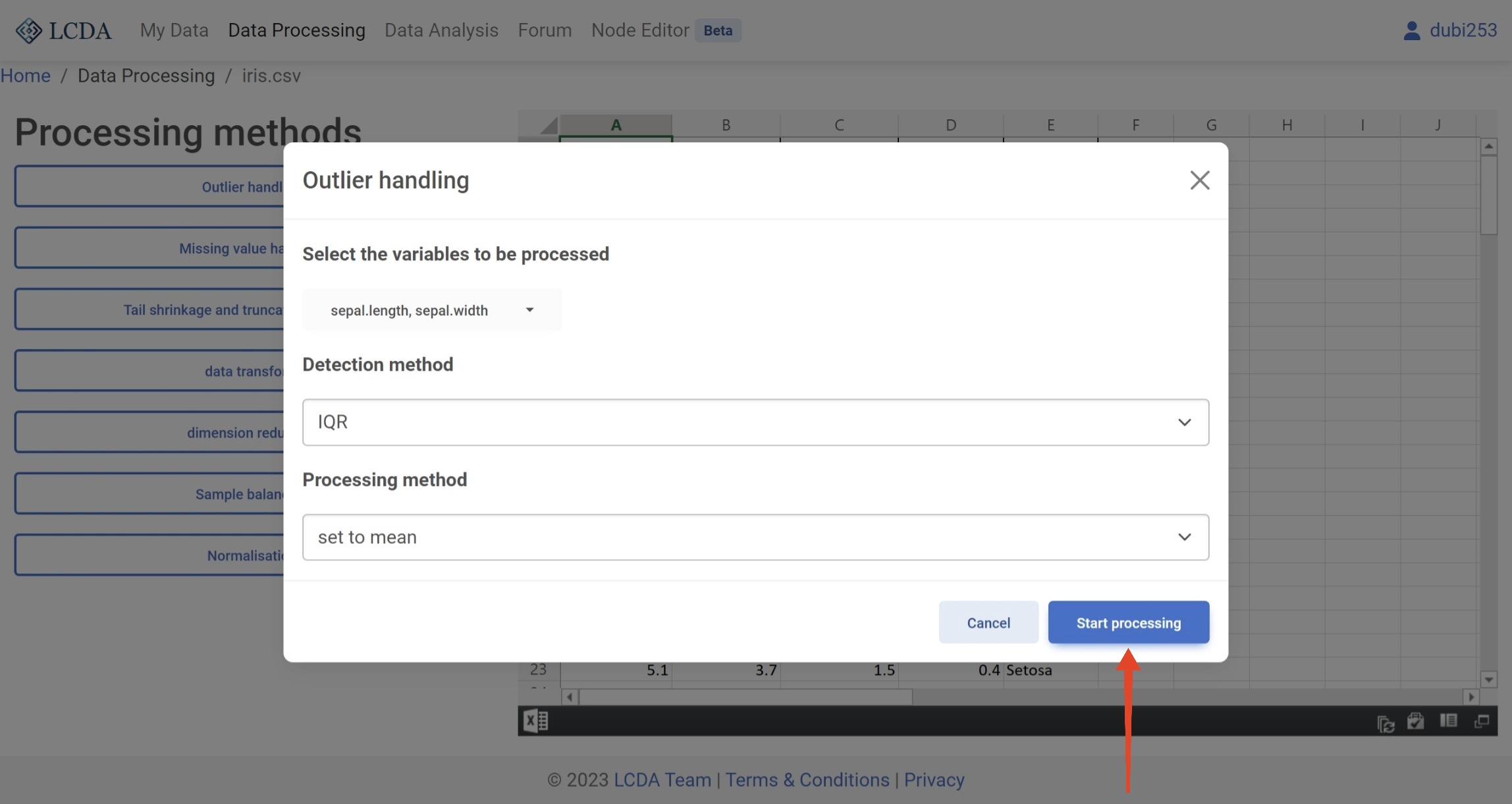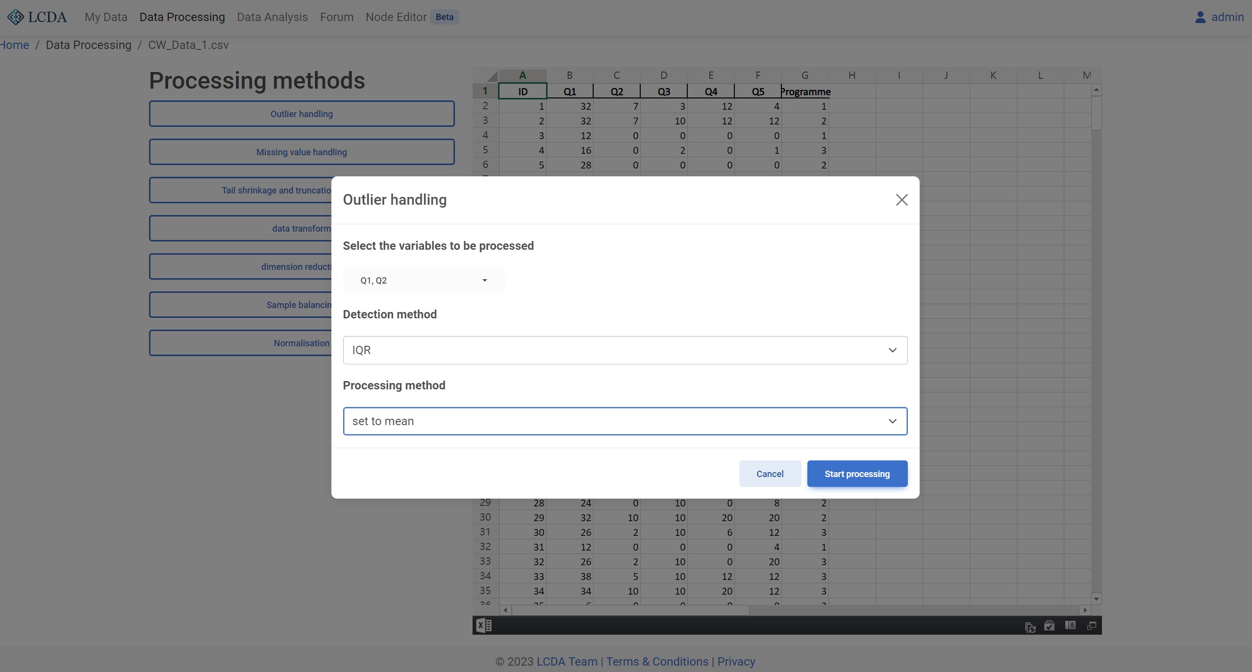 Outlier handlingalgorithm as an example. Once you have selected the algorithm and set the parameters, you can click on theStart processingbutton located in the lower right corner of the panel to initiate the algorithm.