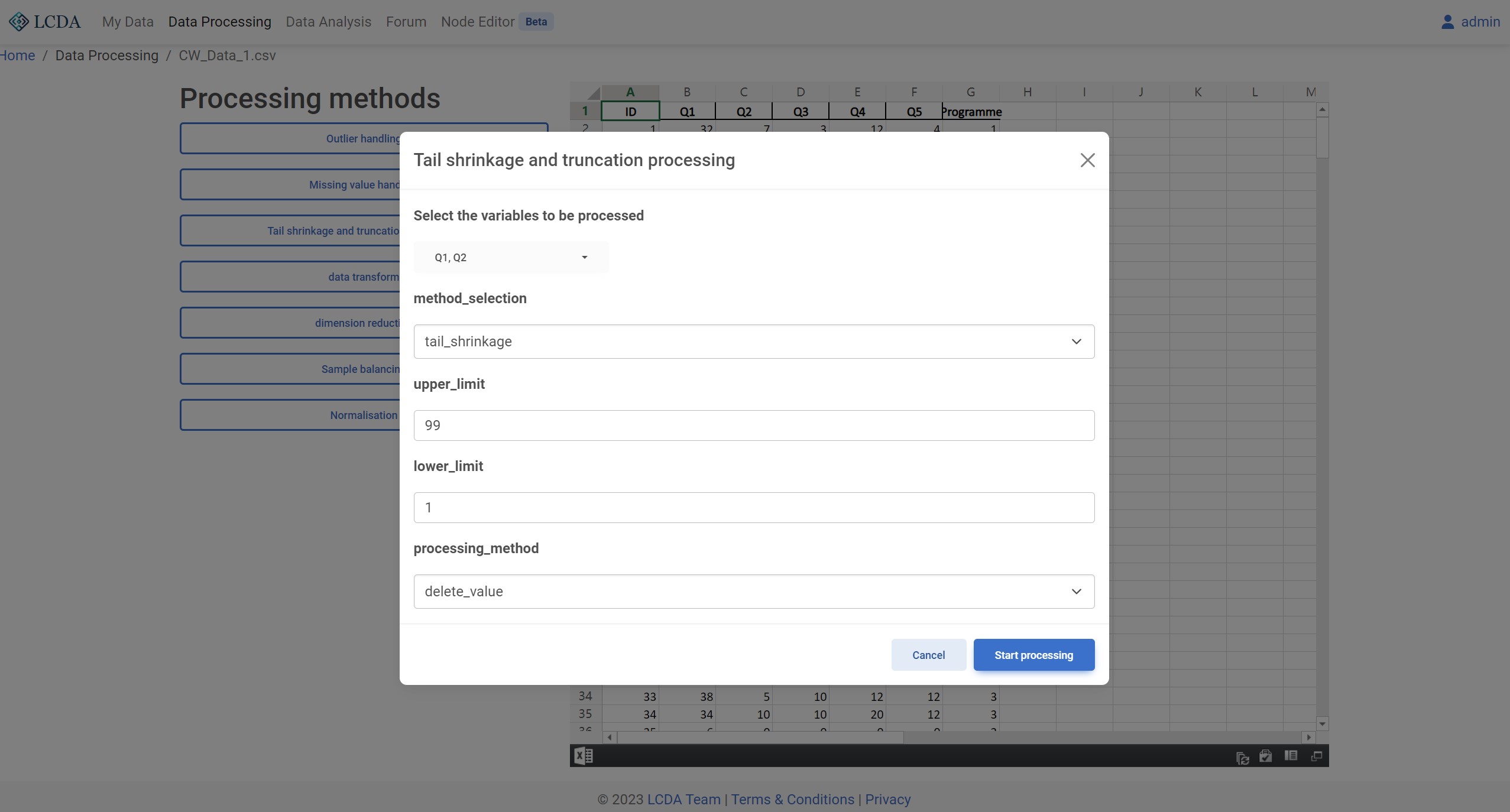 method_selection: Tail shrinkage and truncation processing method. Currently supportstail_shrinkageandtail_truncationtwo methods.upper_limit: Upper limit of the tail shrinkage and truncation processing. Data types are numeric.lower_limit: Lower limit of the tail shrinkage and truncation processing. Data types are numeric.processing_method: Tail shrinkage and truncation processing method. Currently supportsdelete_valueanddelete_rowtwo methods.