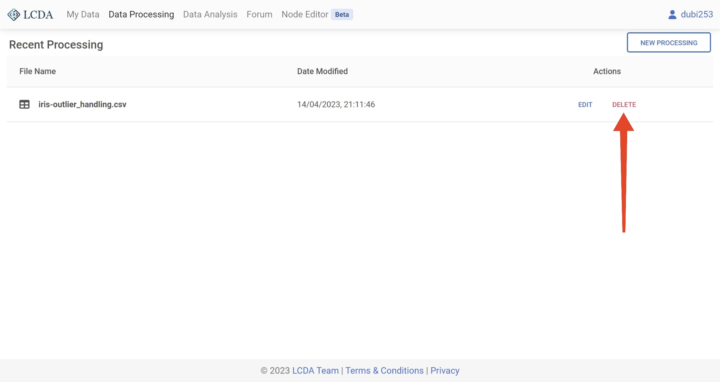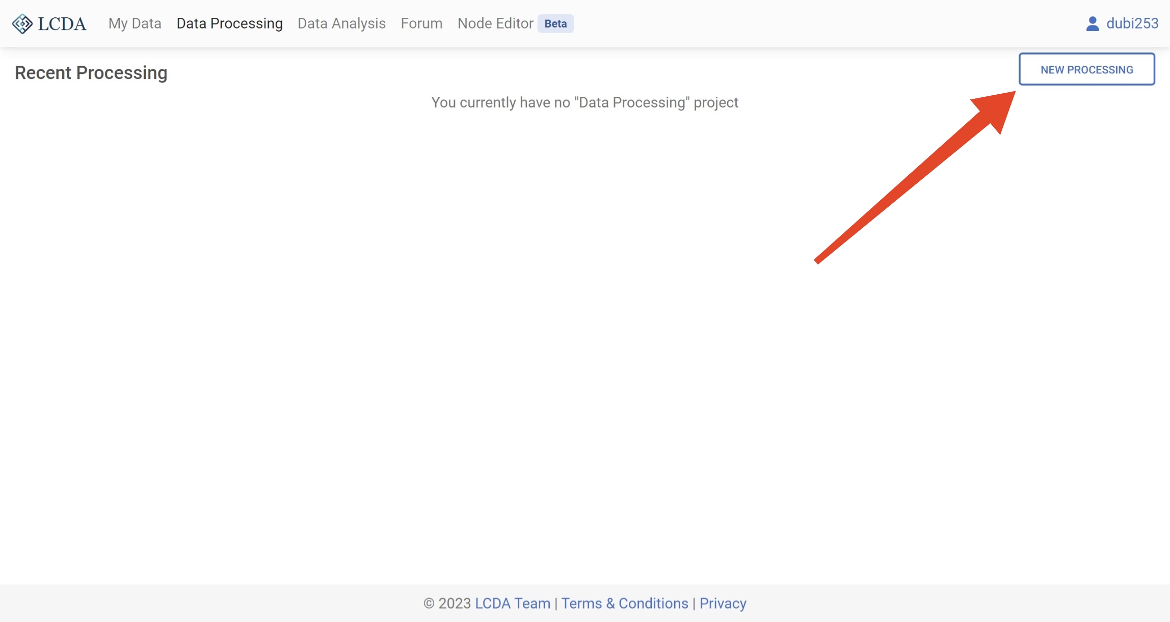 Before beginning data processing in LCDA, you will need to create a new data processing project. This can be done by clicking on the NEW PROCESSING button located in the upper right corner of the Data Processing interface.