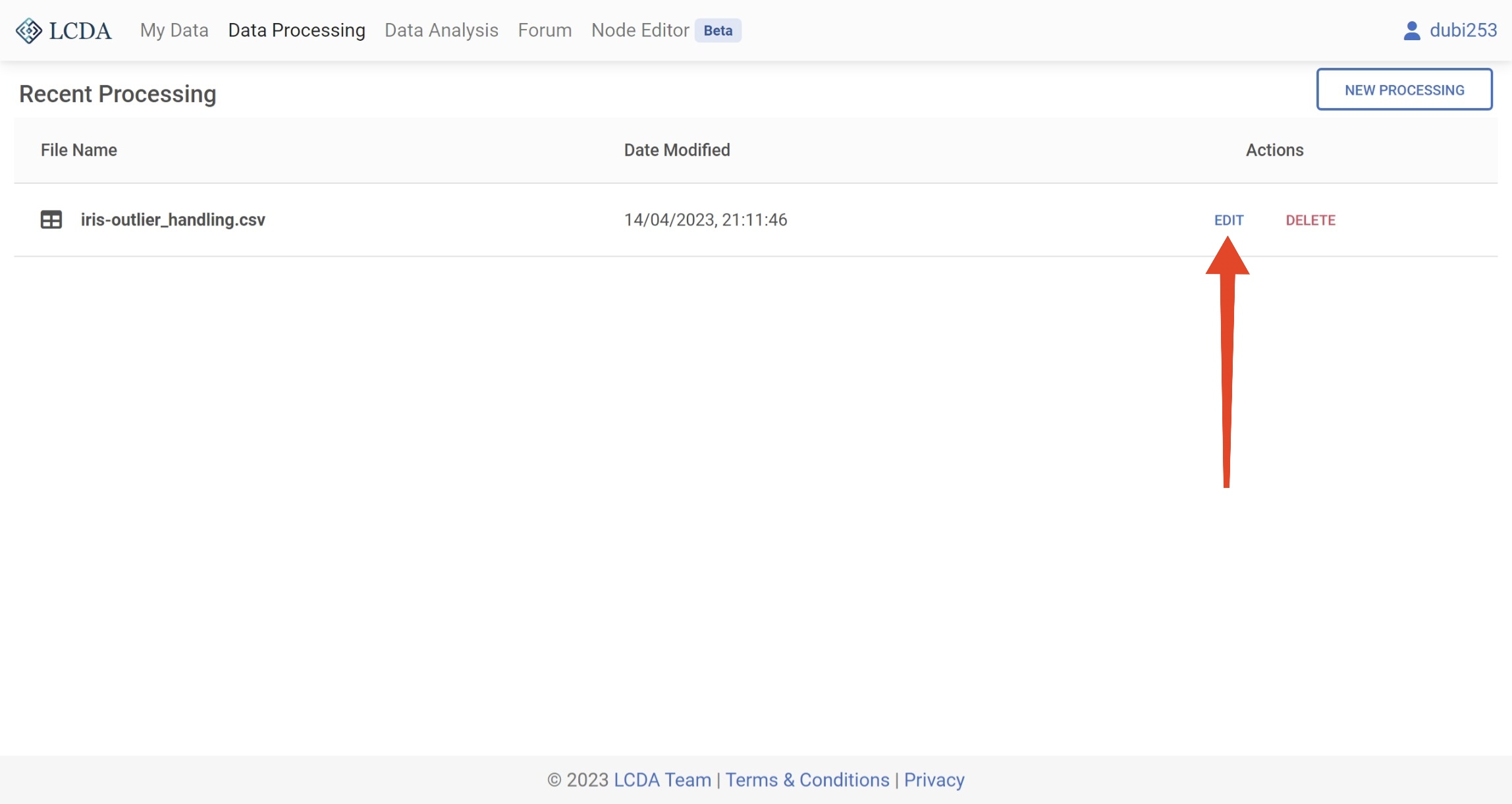 If you have already created a data processing project, the data processing interface will list all of your data processing projects. You can click on the EDIT button on the right to continue editing an existing data processing project.